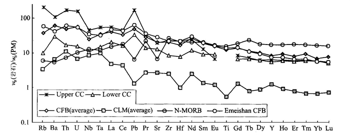 CLM(average).大陆岩石圈地幔的平均值[30]; N-MORB.正常大洋中脊玄武岩; CC.大陆地壳
