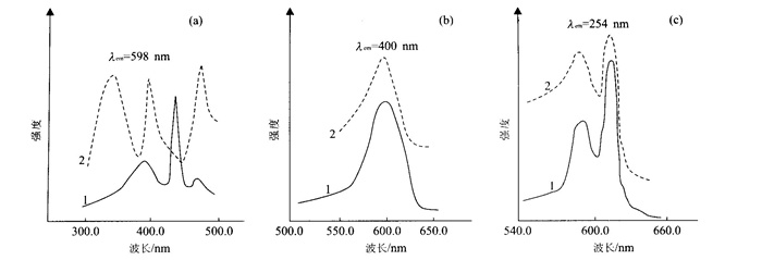 摘要: 用溶胶-凝胶法(sol gel) 制备了纳米荧光粉Y4Al2 O9: Eu3+, 用X射线粉晶衍射对其进行了物相鉴定, 表明在90 0℃已经得到纯相的Y4Al2 O9产物, 并用透射电镜对其进行形貌和衍射分析, 分析结果证明得到的产物为纳米粉末态晶体, 产物Y4Al2 O9: Eu3+粒径均匀, 大致在2 0~ 5 0nm之间, 平均粒径为30nm.并用荧光光度计对其荧光光谱进行了研究, 光谱表明Eu3+在Y4Al2 O9晶格中占据两种不同的位置.用λ =2 5 4nm的紫外光激发Y4Al2 O9: Eu3+时, 产生两条发光谱带, 即由于5D0 →7F1的跃迁产生在峰值λ =5 90nm处的橙色发光带, 和5D0→7F2跃迁在峰值λ =6 10nm处的红色发光带.Abstract: Nano fluorescent powder of Y4Al2 O9: Eu3+ is synthesized by sol gel method. The XRD shows that the production prepared at 900 ℃ is pure phase Y4Al2 O9: Eu3+. Y4Al2 O9 powder is a nano crystal testified by BF and ED analyses of TEM. The grain diameter of Y4Al2 O9 ranges from 20 to 50 nm, averaged at 30 nm. The luminescent spectra show that Eu3+ ions occupy two kinds of sites in Y4Al2 O9 crystal lattice, one in the strict inversion center, and the other in off lying inversion center. When excited with UV light (λ =254 nm), Y4Al2 O9: Eu3+ exhibits the orange emission band at λ =590 nm due to the 5D0→ 7F1 transition and the red emission band at λ =610 nm due to the 5D0→ 7F2 transition.