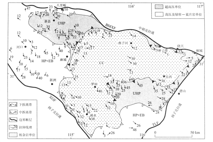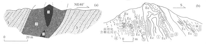 a: 1.石榴橄榄岩; 2.块状榴辉岩; 3. 面理化榴辉岩.b: ①面理化榴辉岩(Ec); ②退变质榴辉岩; ③高压片麻岩; ④面理化含榴花岗岩; ⑤角闪岩相剪切带