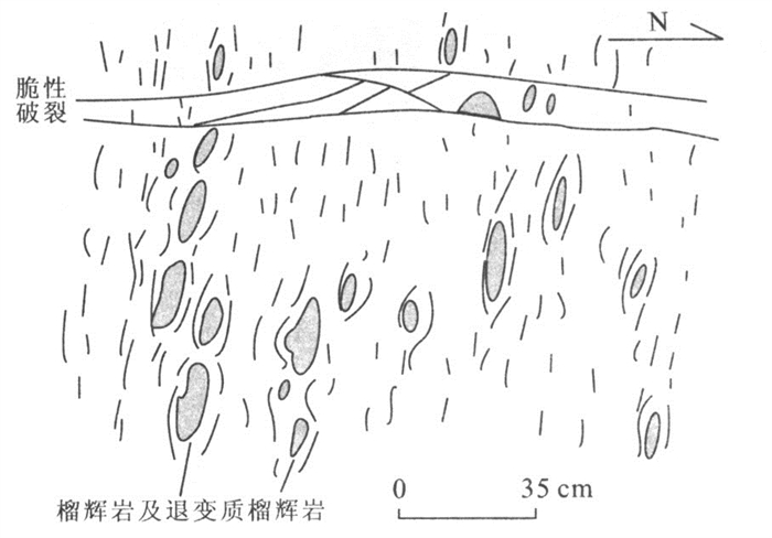图 2 露头尺度的横剖面, 表示(a) 具小的石榴橄榄岩透镜体的块状榴辉岩与面理化榴辉岩的几何关系, 碧溪岭; (b) 面理化榴辉岩、高压片麻岩及退变质榴辉岩与面理化花岗岩的几何关系, 荣城市大疃
