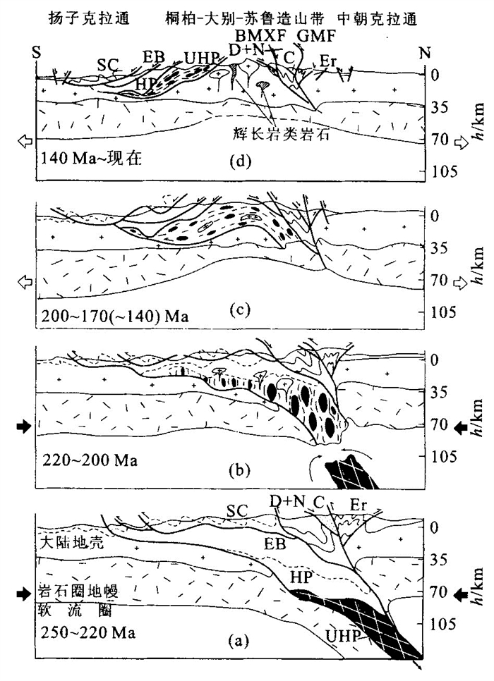(a) 深俯冲和碰撞阶段, 超高压和高压变质岩形成, 出现地壳堆垛楔; (b) 超高压和高压变质岩初期折返阶段, 形成挤出楔, 伴随减压部分熔融作用; (c) 第二阶段折返, 以碰撞期后地壳伸展和薄化作用为特征; (d) 第三折返阶段, 晚造山塌陷伴随大规模岩浆岩活动.GMF.龟梅断裂带; BMXF.八里畈-磨子潭-晓天断裂带; UHP.超高压单位; HP.高压单位; EB.绿帘-蓝片岩单位; SC.沉积盖层; Er.二郎坪群; C.石炭系; D+N.定远组及南湾组