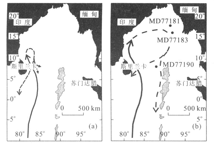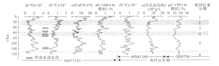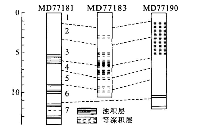 摘要: 实地观测和对沉积记录的研究表明, 孟加拉湾存在强大的等深流活动.通过采自孟加拉深海扇东部和中部的3支活塞岩心的沉积学研究表明, 那些氧化色彩强烈、钙质生物壳体溶蚀严重、不存在粒序层理的粉砂质薄层实际上是等深积作用的产物.源自两极的等深流是全球温盐循环系统的关键组分, 它们在过去15 0ka的历史中曾经多次得到强化, 不仅对研究区的环境变化产生重要影响, 而且可能作为纽带, 加强了低纬地区与极区在气候意义上的遥相关.等深流的强化与冰川旋回之间似乎不存在密切关联, 氧同位素第3, 4, 5期内均可发现明显的强化记录.关于强化的控制机制有待深入探讨.Abstract: The analysis of measured data and sedimentary records shows that strong contour currents-occur in the Bay of Bengal. The sedimentary research into 3 piston cores from the middle and eastern Bengal deep-water fan indicates those thin-bedded muddy silts, with heavy oxidation colors and a few calcareous gravely-corroded shells but free of any graded bedding, are products of deposition of reworked materials by geostrophic bottom currents. The contour currents derived from the Arctic and Antarctic, essential constituents of the global thermohaline circulation, were repeatedly enhanced in the past 150 ka. This intensification of the currents, presenting a great impact on the environment changes in the province under study, may serve as a link to make a climatic enhancement of the tele-connection between the low-latitude and the pole regions. It is very unlikely that there is a close relation between the intensifications of the contour currents and the glacial cycles. The records of intensified contour currents can be observed in oxygen isotope stages 3, 4 and 5. The enhanced controlling mechanism remains to be further investigated.