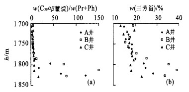 Fig.  3.  a. Relationship between (1, 2, 4-) / (2, 3, 6-TMN) ratios and contents of triaromatic steroids; b. (2, 3, 6-) / (1, 3, 5-+1, 4, 6-TMN) ratios varied with depth at different oil columns
