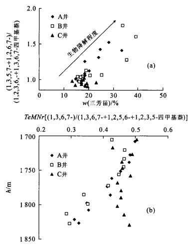 Fig.  4.  a.Relationship between (1, 3, 5, 7-+1, 2, 6, 7-) / (1, 2, 3, 6-+1, 3, 6, 7-TeMN) ratios and contents of triaromatic steroids; b. (1, 3, 6, 7-) / (1, 3, 6, 7-+1, 2, 5, 6-+1, 2, 3, 5-TeMN) ratios varied with depth at different oil columns