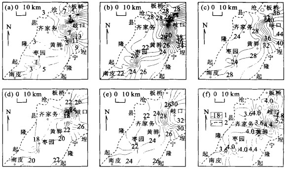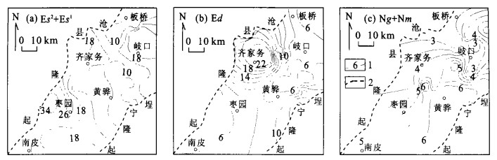 a.老第三纪末Es2+Es1渗流场; b.第三纪末Es2+Es1渗流场; c.第四系沉积末Es2+Es1渗流场; d.第三纪末Ed渗流场; e.第四系沉积末Ed渗流场; f.第四系沉积末Ng+Nm渗流场; 1.等水压线(MPa); 2.盆地边界线