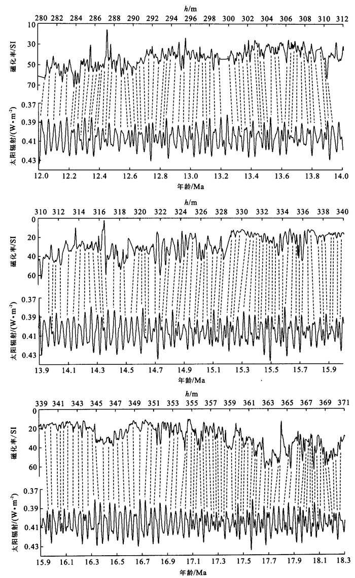 图  2  南海北部ODP1148站磁化率记录(280~370 m) 与北半球高纬太阳辐射曲线(12~18.3 Ma).磁化率的极大值与太阳辐射曲线的极小值相对应