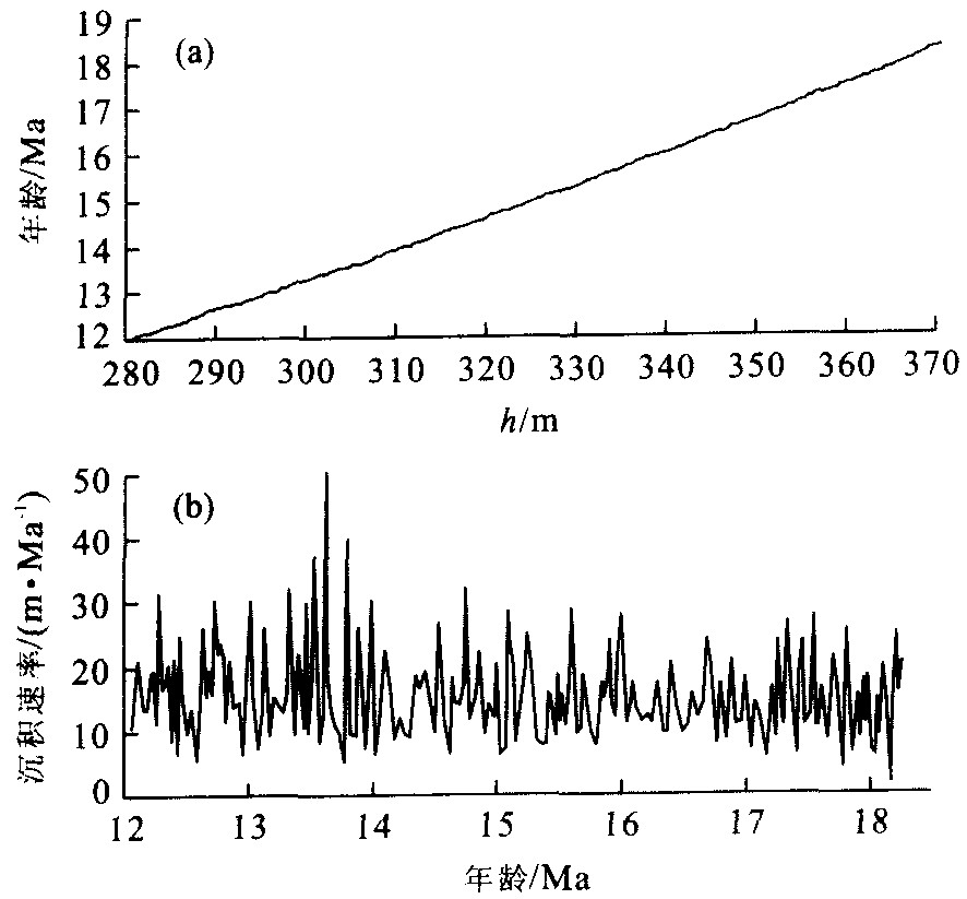 图  3  南海北部ODP1148站深度与年龄的关系(a) 以及线性沉积速率(b)