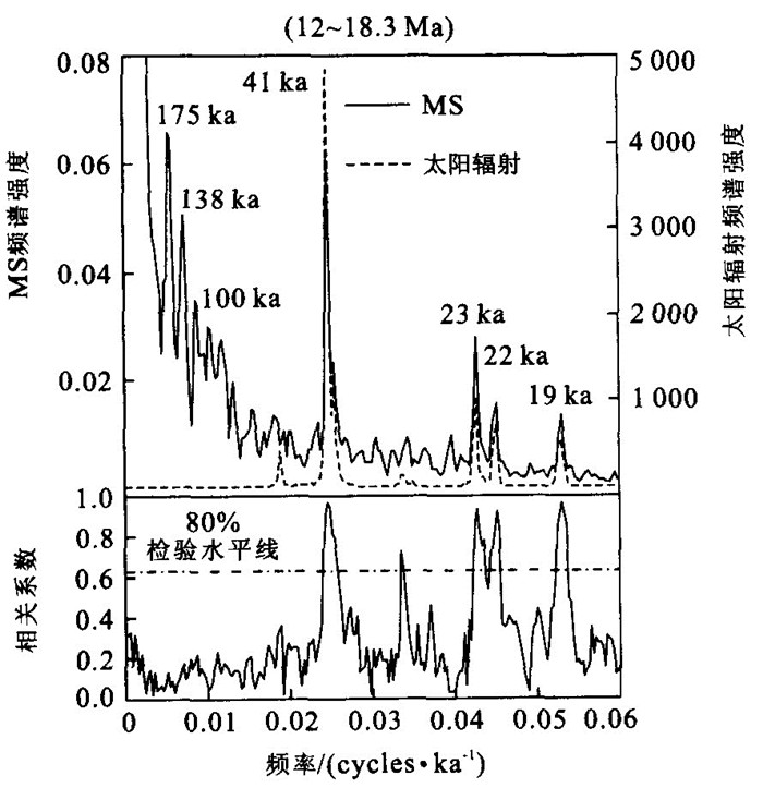 图 4上部的实线代表磁化率的频谱, 虚线代表太阳辐射记录的频谱; 图 4下部的实线代表相关系数
