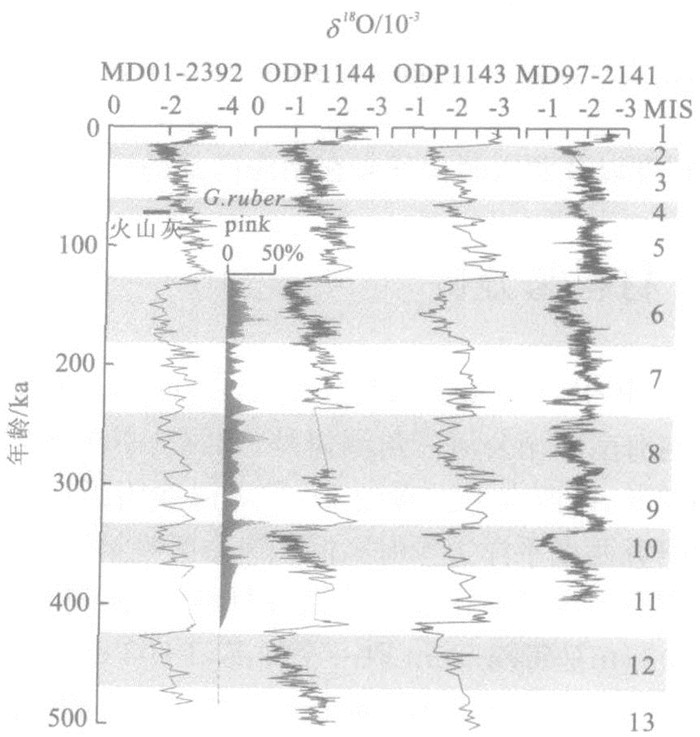 ODP 1144孔据Bühring et al. (2004); ODP 1143孔据Tian et al. (2002); MD97-2141孔据Oppo et al. (2003)