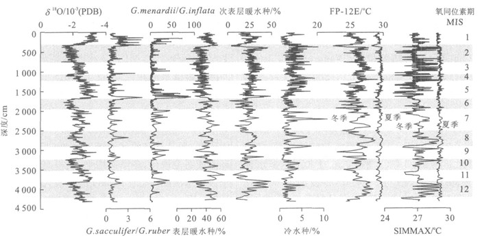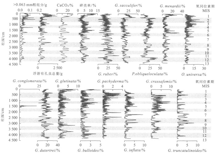 表层暖水种包括G. sacculifer, G. conglobatus, G. ruber; 次表层暖水种包括G. menardii, G. tumida, G. aequilateralis, G. conglomerata, P. obliquiloculata, 冷水种包括G. inflata, N. pachyderma, G. quinqueloba, G. bulloides