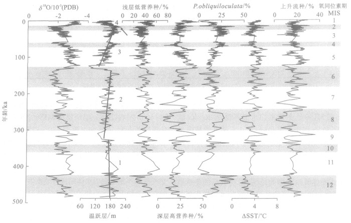表层低营养种: G. ruber, G. sacculifer, G. glutinata; 次表层至深层高营养种: N. dutertrei, N. pachyderma, G. menardii; 上升流种: N. dutertrei, N. pachyderma, G. bulloides.1~4为温跃层深度变化分段