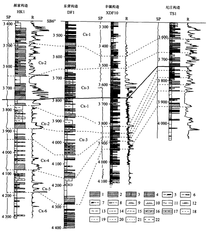 Cs.上部旋回; Cx.下部旋回; 1.石盐岩; 2.石膏岩; 3.石膏质石盐岩; 4.含石膏石盐岩; 5.泥质石盐岩; 6.泥质石膏岩; 7.石盐质泥岩; 8.石膏质泥岩; 9.含石盐泥岩; 10.含石膏泥岩; 11.软泥岩; 12.油页岩; 13.泥岩; 14.灰质泥岩; 15.白云质泥岩; 16.白云岩; 17.灰岩; 18.粉砂岩; 19.灰质粉砂岩; 20.白云质粉砂岩; 21.泥质粉砂岩; 22.砾岩; SP.自然电位曲线(mV); R.电阻率(π·m)
