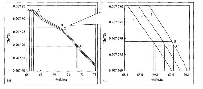 图 4 a) 65~75 Ma海水的锶同位素演化曲线, 由Howarth and McArthur (1997) 的锶同位素比值-年龄数据表作出, A, B, C, D为本文所讨论的4个厚壳样品的编号; (b) 图(a) 中样品B和C所在部位的局部放大, 1为年龄值置信区间下限值, 2为最佳年龄值, 3为年龄值置信区间上限值