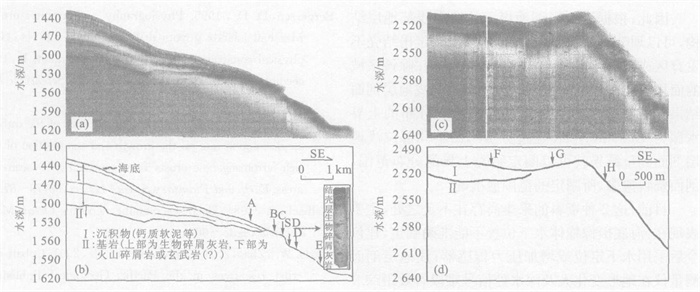 A-H为图 4中对应的图号, SD为浅钻取样位置; a, b. A段(水深1 425~1 620 m); c, d. B段(水深2 505~2 610 m); a, c为实测剖面; b, d为解释结果