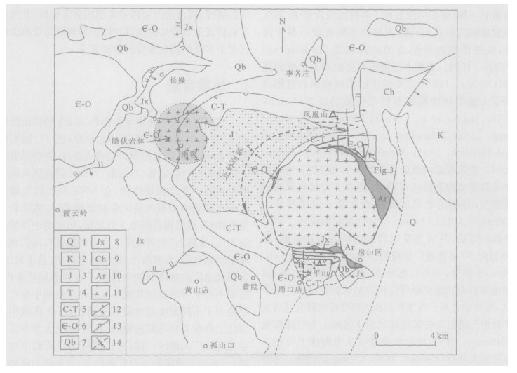 1.第四系; 2.白垩系; 3.侏罗系; 4.三叠系; 5.石炭—三叠系; 6.寒武系—奥陶系; 7.青白口系; 8.蓟县系; 9.长城系; 10.太古宙; 11.花岗岩; 12.逆断层; 13.剥离断层; 14.向斜