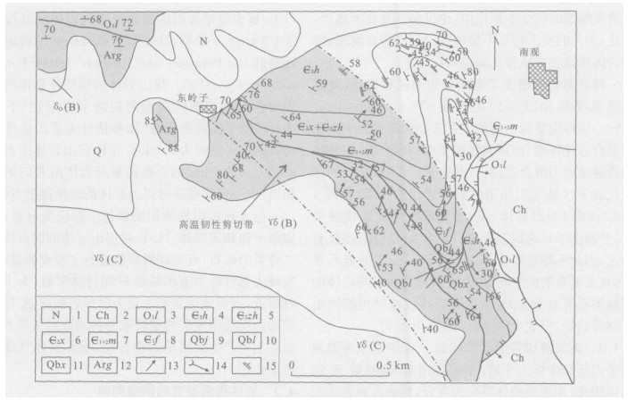 1.上第三系; 2.长城系; 3.亮甲山组; 4.黄院组; 5.张夏组; 6.徐庄组; 7.馒毛组; 8.府君山组; 9景儿峪组; 10.龙山组; 11.下马岭组; 12.关坻杂岩; 13.拉伸线理; 14小褶皱枢纽; 15.劈理产状