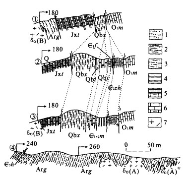 1.构造片麻岩; 2.构造片岩; 3.变余糜棱岩; 4.千枚岩或板岩; 5.条带状大理岩; 6.灰岩或泥灰岩; 7.花岗闪长岩