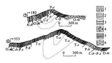 1.角岩; 2.砂岩; 3.千枚岩或板岩; 4.砾岩; 5.变质砂岩; 6.灰岩; ∈3h.黄院组; O1m.马家沟组; C2b.本溪组; C2t.太原组; P1s.山西组; P2y.杨家组; P2h.红庙岭组; T1s.双泉组