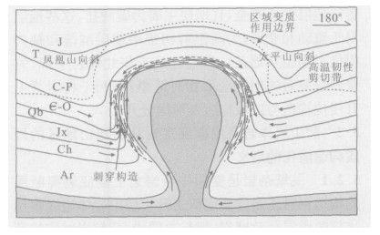 • 摘要: 运用底辟构造的理论和模型, 通过对北京西山房山岩体边缘围岩构造、变形和应变的研究, 厘定出岩体边缘的高温剪切带、周缘向斜、呈穹状分布陡倾的线理和面理, 并结合对西山区域构造事件分析后提出房山岩体为典型的岩浆底辟构造(HotStokesDiapir).这项研究成果不仅在世界上首次证实了岩浆底辟的存在, 而且对理清北京西山地区的地质构造格架和演化序列具有十分重要的意义.研究认为房山地区可能不存在变质核杂岩; 房山岩体边缘的关坻太古宙杂岩是基底岩石随岩体底辟流动上升带到地壳上部的; 原先确定的一些印支期“剥离断层”是房山岩体岩浆底辟的刺穿构造或围岩高温剪切作用造成的地层缺失; 太平山和凤凰山等向斜是岩体底辟过程中在围岩拖曳下形成的周缘向斜.