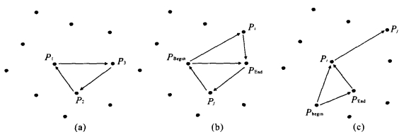 图  2  中心三角形与初始多边形(a)以及新三角形的形成(b)与多边形的扩展(c)