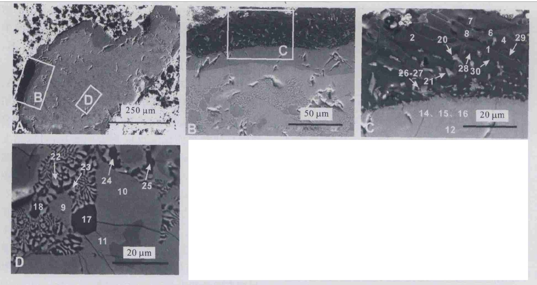 TiFe合金颗粒从内至外被3个带所环绕,分别是: (1)自然钛; (2)TiSi合金; (3)柯石英-蓝晶石为主的硅酸岩和氧化物带.柯石英-蓝晶石为主的硅酸岩和氧化物带主要在图的左下最外层(暗色部分)(A); 自然钛带发育最完全,几乎围绕了整个颗粒(深灰色)(B); 钛硅合金(Ti6.9Fe0.2Si2.8)为仅仅宽约10 μm的带,位于(1)和(3)带之间,从BSE图像中与自然钛不易区分,由图C中分析点14, 15, 16所控制,分析点12成分已是自然钛; 主体钛铁合金(Ti6.2Si0.3Fe3.4)中出现由自然钛(暗色)和相对低Ti的钛铁合金(Ti5.5Si0.1Fe3.9)组成的蠕英构造(D)