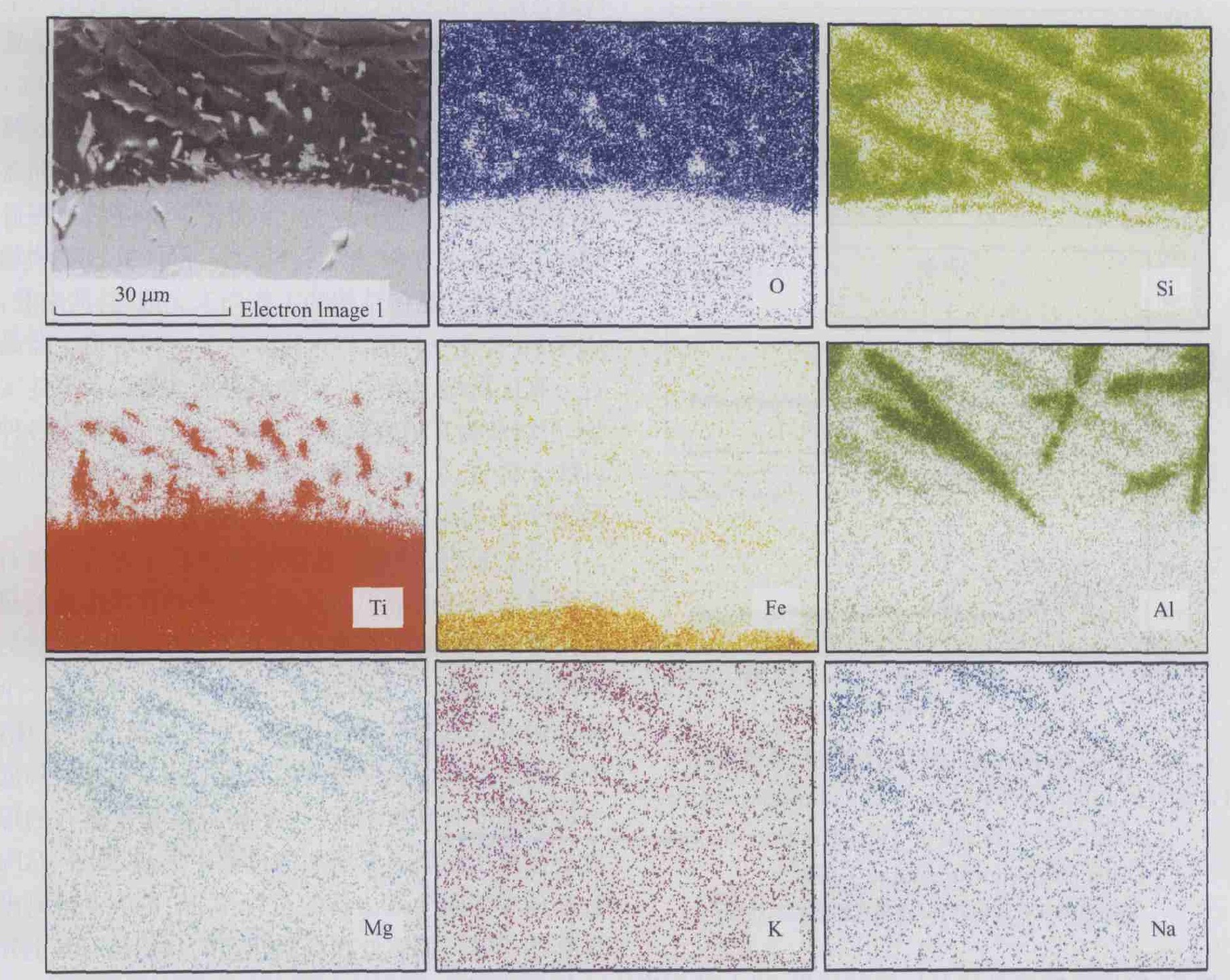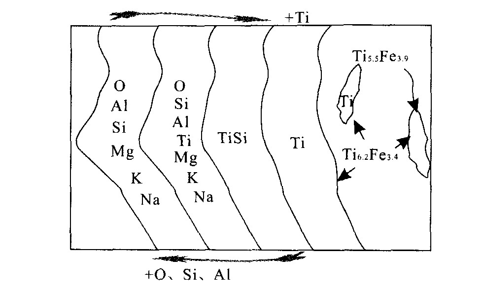 外带显示Si、Al和O为主, Si高于Al, 反映柯石英的量远远高于蓝晶石, 带中靠近自然钛部分出现少许Ti, 远离则减少, K、Mg和Na只出现在柯石英-蓝晶石带; 自然钛带与柯石英-蓝晶石带之间有一薄层Si, 代表TiSi合金带; Fe仅仅在TiFe合金中出现