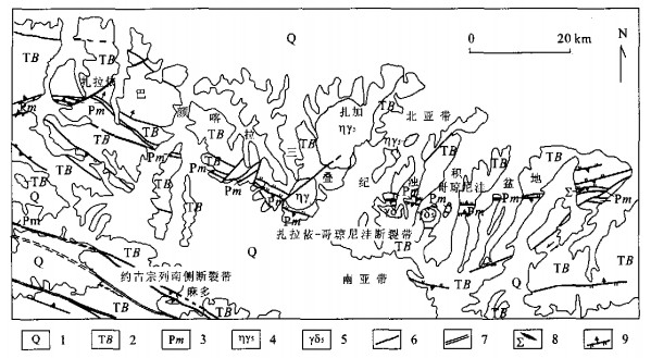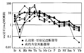 摘要: 东昆仑巴颜喀拉浊积盆地内沿扎拉依-哥琼尼洼断裂带及约古宗列断裂带的断夹块内出露有一套二叠纪马尔争组火山岩, 火山岩呈构造岩片形式产出, 扎拉依-哥琼尼洼断裂带火山岩岩石组合主要为玄武岩、玄武安山岩, 少量玄武岩具枕状构造, 岩石SiO2含量均匀, TiO2的含量较高, ALK的含量较低, 为拉斑系列的玄武岩, 玄武岩稀土总量较高, 稀土配分曲线为轻稀土富集型, 与洋岛型火山岩的稀土配分曲线相一致, 火山岩大离子亲石元素较富集, 高场强元素及重稀土元素较平坦, 稀土、微量元素特征及构造环境判别显示其形成于较富集的洋岛环境, 少数为洋中脊的构造环境.约古宗列断裂带火山岩岩石组合为玄武岩、玄武安山岩, 岩石SiO2含量较高, TiO2含量较低, 均 < 1%, 为钙碱性系列火山岩, 玄武安山岩的稀土配分曲线与扎拉依-哥琼尼洼断裂带一致, 而英安岩的轻稀土富集程度高, 与岛弧高钾安山岩的稀土配分曲线相吻合, 构造环境判别显示其形成于岛弧构造环境.根据扎拉依-哥琼尼洼断裂带两侧火山岩成分的差异以及断裂带两侧巴颜喀拉群碎屑物成分的差异, 可以把巴颜喀拉山三叠纪浊积盆地进一步划分为北亚带和南亚带.Abstract: Permian volcanic rocks are developed in fault nip blocks of the Zanayi-Geqiongniwa and Yueguzonglie fault zones in the Bayan Hala turbidite basin, east Kunlun area. Volcanic rocks are output in tectonic slices. The volcanic rock assemblage in the Zanayi-Geqiongniwa fault zone is mainly basalts and basaltic andesites, some with the pillow structure. The SiO2 content of the volcanic rocks is uniform, the TiO2 content is higher and the ALK content is lower. The rock type is mainly tholeiitic basalt. REE distribution patterns of which are LREE-rich type and consistent with those of ocean island type volcanic rocks, the large ion lithophile elements of volcanic rocks is more enrichment, HFS elements and HREE of them is flatten. The characteristics of REE, trace elements and tectonic setting distinguishing reveal that the volcanic rocks of the Zanayi-Geqiongniwa fault belt were formed mainly in an ocean island tectonic setting, while some were formed in a middle ocean ridge tectonic setting. The volcanic rock assemblage in the Yueguzonglie fault zone consists of basalt and basaltic andesite. Their SiO2 content is higher, while TiO2 content is less than one percent. The rock types are calc-alkaline series. REE distribution patterns of basaltic andesite are consistent with that of the volcanic rocks in the Zanayi-Geqiongniwa fault zones, that of dacite is high rich in LREE and consistent with island arc high-K andesite. Tectonic setting distinguishing reveals that the volcanic rocks of the Yueguzonglie fault belt are formed in island arc tectonic setting. According to the differing contents of the volcanic rocks and clast from the Bayan Hala Group beside the Zanayi-Geqiongniwa fault belt, we can divide the Bayan Hala turbidite basin into north subbelt and south subbelt.