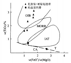 图 10 巴颜喀拉地区二叠纪火山岩w (TiO2) -w (FeO*) /w (MgO) 图(Miyashiro, 1975)