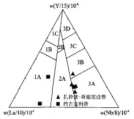 图 11 巴颜喀拉地区二叠纪火山岩w (Y/15) -w (La/10) -w (Nb/8) 图(Cabanis and Lecolle, 1989)