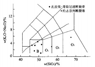 图中碱性亚碱性界线据Irvine and Baragar, 1971; B.玄武岩; O1.玄武安山岩; O2.安山岩; O3.英安岩
