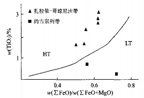 图 8 巴颜喀拉地区二叠纪火山岩w (∑FeO) /w (∑FeO+MgO) -w (TiO2) 图(据Serri et al., 1985)