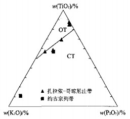 图 9 巴颜喀拉地区二叠纪火山岩w (K2O) -w (TiO2) -w (P2O5) 图(Pearce, 1975)
