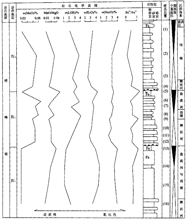 摘要: 利用岩石化学中各种氧化物及相关比值在陆相盆地沉积作用中的不同表现性质, 讨论了上黑龙江盆地绣峰组Ⅳ级层序形成的气候、水体、沉积体系及基准面变化特征.绣峰组Ⅳ级层序自下部向中部Fe2O3、Fe3+/Fe2+、K2O、Na2O等值逐渐减小; MnO、FeO、MgO、LOS等含量逐渐增高; 层序中部向上部Fe2O3、K2O、Na2O等值逐渐增大, MnO、FeO等含量逐渐减少, 显示了绣峰组Ⅳ级层序在气候旋回控制下由水体加深、气候潮湿向水体变浅、气候干旱演变的中期基准面对称旋回特征.这一研究成果为陆相盆地高频层序划分提供了新思路.Abstract: Use different expressions of the various oxides and relevant ratio of lithochemistry in continental basin, this paper discusses the forming climate, water body, depositional system and base level characteristics of level Ⅳ sequence in Xiufeng Formation of upper Heilongjiang basin. Fe2O3, Fe3+/Fe2+, K2O, Na2O, etc. decreased gradually from bottom to middle in level Ⅳ sequence of Xiufeng Formation; MnO, FeO, MgO, LOS, etc. increased gradually; from middle to top, Fe2O3, K2O, Na2O, etc. increased gradually, MnO, FeO, etc. decreased. The symmetrical cycle characteristics show that the base level of the middle period is from a deep water body and a damp climate, changing to a shallow water body and dry climate in level Ⅳ sequence of Xiufeng Formation. This study provides a new thought for high frequency sequence division of continental basin.