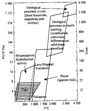 Fig.  1.  Temperature and pressure regimes corresponding to earth processes. The "Data" area indicates the region in which well characterized experimental data can be found