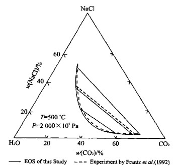 图  12  NaCl-H2O-CO2体系的气液相平衡(温度等于500 ℃, 压力为2 000×105 Pa)——状态方程的预测结果与Frantz et al. (1992)的合成流体包裹体实验数据的比较