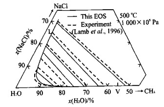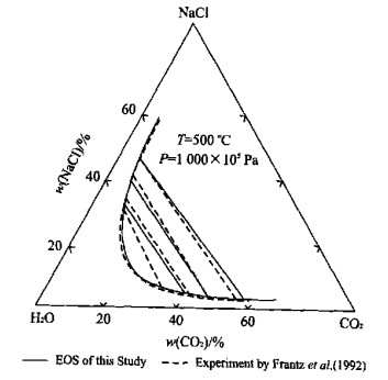 图  13  NaCl-H2O-CO2体系的气液相平衡(温度等于500 ℃, 压力为1 000×105 Pa)——状态方程的预测结果与Frantz et al. (1992)的合成流体包裹体实验数据的比较