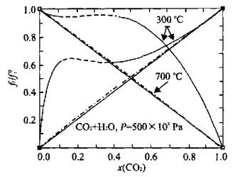 Fig.  5.  Ratio of mixture fugacities to end-member fugacities of CO2 and H2O in their mixtures at 300 ℃ and 700 ℃. The dashed lines show the two-phase region. The diagonal solid lines represent ideal mixing