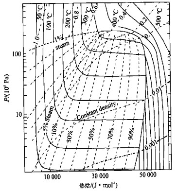 Fig.  8.  Enthalpy-temperature-density relationships for CO2-H2O mixtures. The steam ratio and wellhead temperature for a geothermal well can be obtained from this diagram