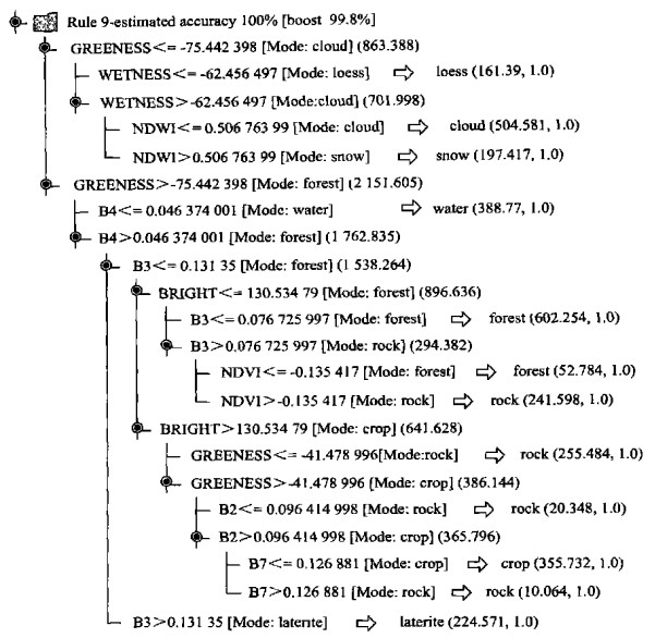 Bauer, E., Kohavi, R., 1999. An empirical comparison of voting classification algorithms: Bagging, boosting, and variants. Machine Learning, 36: 105-139. doi: 10.1023/A:1007515423169 Clark, R.N., Swayze, G.A., 1995. Mapping minerals, amorphous materials, environmental materials, vegetation, water, ice and snow, and other materials: The USGS tricorder algorithm. Summaries of the Fifth Annual JPL Airborne Earth Science Workshop, January 23-26, R.O. Green, Ed., JPL Publication 95-1, 39-40. Friedl, M.A., Brodley, C.E., 1997. Decision tree classification of land cover from remotely sensed data. Remote Sensing Enviro. , 61(3): 399-409. doi: 10.1016/S0034-4257(97)00049-7 Friedl, M.A., Strahler, C.E., 1999. Maximizing land cover classification accuracies produced by decision trees at continental to global scales. IEEE Transactions on Geoscience Remote Sensing, 37(2): 969-977. doi: 10.1109/36.752215 Heath, D., Kasif, S., Salzberg, S., 1993. Learning oblique decision trees. In: Proc. 13th Int. Joint Conf. Artificial Intelligence, 1002-1007. Menenti, M., Lorkeers, A., Vissers, M., 1986. An application of thematic mapper data in Tunisia. ITC Journal, (1): 35-42. Mulders, M.A., Epema, G.F., 1986. The thematic mapper: A new tool for soil mapping in arid areas. ITC Journal, (1): 24-29. Paul, L.R., 2001. Robust pixel unmixing. IEEE Transactions on Geoscience and Remote Sensing, 39(9): 1978-1983. doi: 10.1109/36.951088 Quinlan, J.R., 1993. C4.5: Programs for machine learning. Morgan Kaufmann Publishers, Inc., San Mateo, CA. Rasoul, S.S., David, L., 1991. A survey of decision tree classifier methodology. IEEE Transactions on Systems, Man and Cybernetics, 21(3): 660-674. doi: 10.1109/21.97458 Ricchetti, E., 2001. Bisible-infrared and radar imagery fusion for geological application: A new approach using DEM and sun-illumination model. International Journal of Remote Sensing, 22(11): 2219-2230. Safavin, S.R., Langrebe, D., 1991. A survey of decision tree classifier methodology. IEEE Transactions on Systems, Man and Cybernetics, 21(3): 660-674. doi: 10.1109/21.97458 Swain, P.H., Hauska, H., 1997. The decision tree classifier: Design and potential. IEEE Trans. Geosci. Remote Sensing, GE-15: 142-147. Yoav, F., Robert, E.S., 1997. A decision-theoretic generalization of on-line learning and an application to boosting. Journal ofComputer and System Sciences, 55(1): 119-139. doi: 10.1006/jcss.1997.1504 -
