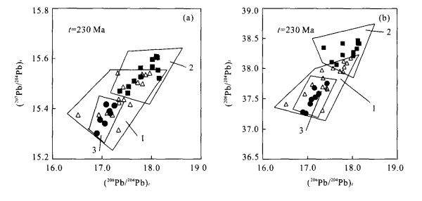 1.超高压变质岩系及其中面理化(含榴)花岗岩(空心三角);2.高压变质岩系(实心方框);3.高压变质岩系中面理化(含榴)花岗岩(实心圆点);超高压变质岩系Pb同位素数据来自文献张宏飞等(2001)和Zhang et al. (2002);铅同位素初始比值(206Pb/204Pb)t、(207Pb/204Pb)t、(208Pb/204Pb)t为t = 230 Ma时计算所得