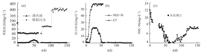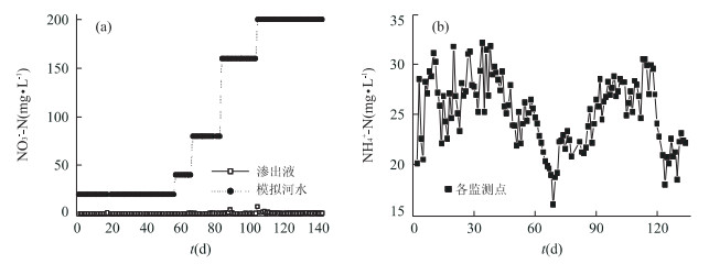 摘要: 通过河岸渗滤作用(riverbankfiltration, RBF) 诱发河水的补给, 增大地下水的允许开采量可以满足更多居民生活饮用水需求.受人类活动的影响, 河流等地表水体遭受苯胺污染, 可能通过RBF进入地下水, 以致饮用该地下水存在健康风险.为研究反硝化条件下, 苯胺在RBF中的转化, 采集渭河河床沉积物及沿岸地下水含水层的含水介质, 装置土柱, 进行土柱动态模拟实验.经过153 d的实验研究发现, 利用苯胺对RBF中土著反硝化微生物进行驯化, 大约经过37d菌种完全适应.具有该菌种的RBF系统, 对苯胺具有巨大降解能力, 在NO3——N约为23.0 mg/L的条件下, RBF系统可使40、80甚至400 mg/L浓度的苯胺100%降解, 矿化率分别达97.99%、91.39%与75.30%.反硝化条件下, 苯胺在RBF中的降解仅有少部分经过脱氨作用, 绝大部分与腐殖质以共价键形式形成耦合物, 该耦合物更易为微生物降解, 且降解过程中不产生对研究环境微生物有毒的中间产物, 可实现反硝化条件下RBF中苯胺的连续降解.Abstract: Aniline can enter the environment from many industries, and has been detected in surface water including river water. For many cities in north China such as Xi'an, Lanzhou and Harbin, the drinking water is produced from groundwater recharged by river water through riverbank filtration (RBF). Aniline is a refractory organic pollutant and harmful to humans. So its degradation and mechanism have received much attention. In this paper, soil columns containing sediment and aquifer media were collected from the Weihe riverbed and its bank, and were used to research the characteristics of aniline degradation in the riverbank filtration process under denitrification conditions. The results indicate that all aniline could be degraded by habituated indigenous microorganisms, and even mostly mineralized under denitrification conditions, but the degradation had a long lag period. A minority of aniline degradation must involve deamination, while the majority undergoes covalent binding with humic substances to form complexes. The complexes are degraded easily and even mineralized. During the degradation, no intermediates were harmful to denitrifiers. Therefore, under denitrification conditions, aniline has the potential to biodegrade in RBF and the potential lasts for long time, and this has not been monitored in the groundwater along the polluted river. During the 153 d testing process, the nitrate-nitrogen concentration was about 23.0 mg/L, and the aniline concentration was 40, 80 and 400 mg/L at 0-74 d, 75-105 d and 106-153 d respectively in infiltrating water. Indigenous microorganisms pass a lag period of 37 d, and grow on aniline as the source of carbon in the RBF under denitrification conditions. Aniline concentration in leachate is lower than the detected limits, so its removal rate was 100%. TOC removal rates were 97.99%, 91.39% and 75.30% for 40, 80 and 400 mg/L aniline concentrations respectively, based on TOC monitored infiltrating water and leachate.