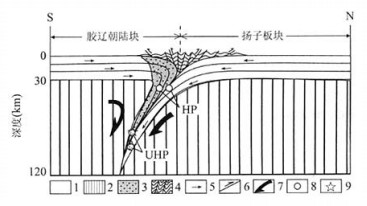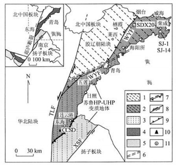 1.基底变质岩石年龄>22亿年的胶辽朝陆块;2.经历超高压变质作用的陆一陆碰撞北苏鲁深俯冲剥蚀体;3.基底变质岩石年龄7~ 8亿年的南苏鲁地体;4.超高压变质带;5.高压变质带;6.胶辽朝陆块与南苏鲁地体的界限;7.韧性逆冲断层;8。走滑断层;9.正断层;10.中国大陆科学钻探(CCSD)孔位;11.本研究锆石SHRIMP U—Pb测年的采样位置及编号