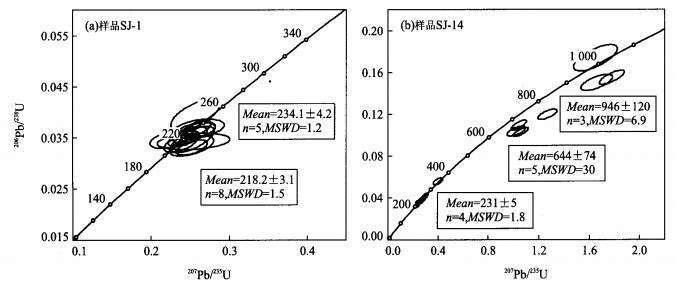 表 2 北苏鲁荣成单家透辉石石英岩(SJ-1)和黑云母片麻岩(SJ-14)锆石SHRIMP U-Pb定年数据
