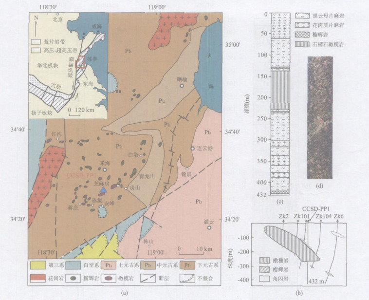 Fig. 1. A simplified geological map of the southern Sulu region(a); profile of the Zhimafang ultramafic body and location of the PP1 drillhole of the Chinese Continental Scientific Drilling(CCSD)(b); a simplified column of the main li- thological units of the PP1(c); and a photograph of the garnet peridotite core(d)