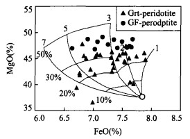图 10 芝麻坊橄榄岩全岩MgO-FeO关系(Boyd et al., 2004)