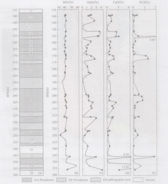 Ames, L., Tilton, G.R., Zhou, G.Z., 1993. Timing of collision of the Sino-Korean and Yangtze cratons. Geology, 21: 339-342. Boyd, F.R., 1989. Compositional distinction between oceanic and cratonic lithosphere. Earth and Planetary Science Letters, 96: 15-26. doi: 10.1016/0012-821X(89)90120-9 Brey, G.P., Kohler, T., 1990. Geothermobarometry in fourphase lherzolites Ⅱ. New thermobarometers, and practical assessment of existing thermobarometers. Journal of Petrology, 31: 1352-1378. Cong, B.L., Zhang, R.Y., Li, S., et al., 1992. Preliminary study of isotopochronology of ecologites in northern Jiangsu and eastern Shangdong provinces, China. In: Exploration of volcanoes and rocks in Japan, China and American: Commemorative papers for Prof. Yukio Matsunoto. Yamaguchi University, Yamaguchi, Japan, 411-417. Cox, K.G., Smith, M.R., Beswetherick, S., 1987. Textural studies of garnet lherzolites: Evidence of exsolution origin from high-temperature harzburgites. In: Nixon, P. H., ed., Mantle xenoliths., 537-550. Hacker, B., Wang, Q. C., 1995. Thermal history of ultrahigh-pressure rocks, Dabie Mountains, China. Tectonics, 14: 994-1006. doi: 10.1029/95TC00932 Harley, S.L., 1984. An experimental study of the partitioning of Fe and Mg between garnet and orthopyroxene. Contributions to Mineralogy and Petrology, 86: 359-379. doi: 10.1007/BF01187140 Hirajima, T., Ishiwatari, A., Cong, B.L., et al., 1990. Identification of coesite in Mengzhong eclogite from Donghai County, northeastern Jiangsu Province, China. Mineralogical Magazine, 54: 579-584. doi: 10.1180/minmag.1990.054.377.07 Jahn, B.M., 1998. Geochemical and isotopic characteristics of UHP eclogites and ultramafic rocks of the Dabie orogen. Implications for continental subduction and collision tectonics. In: Hacker, B., Liou, J.G., eds., When continents collide: Geodynamics and geochemistry of ultrahigh-pressure rocks. Dordrecht, Kluwer, 203-239. Katayama, I., Maruyama, S., Parkinson, C.T., et al., 2001. Iron micro-probe U-Pb zircon geochronology of peak and retrograde stages of ultrahigh-pressure metamorphic rocks from the Kokchetav massif, northern Kazakhstan. Earth and Planetary Science Letters, 188: 185-198. doi: 10.1016/S0012-821X(01)00319-3 Kretz, R., 1983. Symboles for rock-forming minerals. American Mineralogist, 68: 277-279. Li, T.F., Yang, J.S., Zhang, R.Y., 2006. K-rich and carbonatic melt metasomatism in depleted upper mantle: Geochemical evidences from peridotites in pre-pilot hole of Chinese Continental Scientific Drilling Projecct. Earth Science—Journal of China University of Geosciences, 31(4): 457-474(in Chinese with English abstract). Li, S.G., Chen, Y., Cong, B.L., et al., 1993. Collision of the North China and Yangtze blocks and formation of coesite-bearing eclogite: Timing and processes. Chemical Geology, 109: 70-89. Liou, J.G., Zhang, R.Y., 1998. Petrogenesis of a ultrahigh-pressure garnet-bearing ultramafic body from Maowu, Dabie Mountains, east-central China. The Island Arc, 7: 115-134. doi: 10.1046/j.1440-1738.1998.00188.x Liu, F. L., Xu, Z, Q., Liou, Z.G., et al., 2002. Ultrahighpressure mineral inclusions in zircons from gneissic core samples of the Chinese Continental Scientific Drilling site in eastern China. Eur. J. Mineral, 14: 499-512. doi: 10.1127/0935-1221/2002/0014-0499 Liu, F.L., Xu, Z.Q., Liou, Z.G., et al., 2004. SHRIMP UPb ages of ultrahigh-pressure and retrograde metamorphism of gneisses, south-western Sulu terrane, eastern China. J. Metamorphic Geol., 22: 315-326. doi: 10.1111/j.1525-1314.2004.00516.x Nickel, K. G., Green, D. H., 1985. Empirical geothermobarometry for garnet peridotites and implications for the nature of the lithosphere, kimberlites and diamonds. Earth and Planetary Science Letters, 73: 158-170. doi: 10.1016/0012-821X(85)90043-3 Obata, M., Morten, L., 1987. Transformation of spinel lherzolite to garnet lherzolite in ultramafic lenses of the Austridic crystalline complex, Northern Italy. Journal of Petrology, 28: 599-632. doi: 10.1093/petrology/28.3.599 Okay, A.I., Xu, S., Sengör, A.M.C., 1989. Coesite from the Dabie Shan eclogites, central China. European Journal of Mineralogy, 1: 595-598. doi: 10.1127/ejm/1/4/0595 Okay, A.I., Sengör, A.M.C., 1992. Evidence for intra-continental thrust related exhumation of the ultra-high pressure rocks in China. Geology, 20: 411-414. O'Neill, H. St. C., Wood, B.J., 1979. An experimental study of Fe-Mg partitioning between garnet and olivine and its application as a geothermometer. Contributions to Mineralogy and Petrology, 70: 59-70. doi: 10.1007/BF00371872 Powell, R., 1985. Regression diagnostic and robust regression in geothermometer geobarometer calibration: The garnet-clinopyroxene geothermometer revisited. Journal of Metamorphic Geology, 3: 231-243. doi: 10.1111/j.1525-1314.1985.tb00319.x Ravna, E.J.K., 2000. The garnet-clinopyroxene geothermometer: An updated calibration. J. Metamorph. Geol. , 18: 211-219. doi: 10.1046/j.1525-1314.2000.00247.x Rumble, D., Yui, T.F., 1998. The Qinglongshan oxygen and hydrogen isotope anomaly near Donghai in Jiangsu Province, China. Geochemica et Cosmochemica Acta, 62: 3307-3321. doi: 10.1016/S0016-7037(98)00239-7 Schumacher, J. C., 1991. Empirical ferric iron corrections: Necessity, assumptions and effects on selected geothermobarometers. Mineralogical Magazine, 55: 3-18. doi: 10.1180/minmag.1991.055.378.02 Streckeisen, A., 1976. To each plutonic rock its proper name. Earth Sci. Rev. , 12: 1-33. doi: 10.1016/0012-8252(76)90052-0 Wang, X.M., Liou, J.G., 1991. Regional ultrahigh-pressure coesite-bearing eclogitic terrane in central China: EvideGeologynce from country rocks, gneiss, marble, and metapelite. Geology, 19: 933-936. Wang, X.M., Liou, J.G., Mao, H.K., 1989. Coesite-bearing eclogites from the Dabie Mountains in central China. Geology, 17: 1085-1088. Xu, S. T., Liu, Y.C., Chen, G.B., et al., 2005. Microdiamonds, their classifications for the host eclogites from the Dabie and Su-Lu regions in central eastern Chi