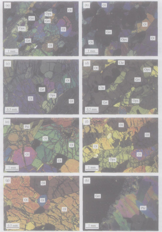 a.石榴石方辉橄榄岩(C21-134-55):等粒结构, 石榴石在空间上与Opx伴生, 甚至很小的颗粒(见箭头); b.石榴石方辉橄榄岩(C34-151- 74): 石榴石变斑晶中橄榄石包体; c.石榴石方辉橄榄岩(C27-144-63): 小颗粒的Grt、Opx和Ol作为粗粒Ol之间的空隙充填物; d.石榴石方辉橄榄岩(C25-141-60): 空间伴生的Grt、Opx和铬铁矿; e.纯橄岩(C31-147-68): 无形变的等粒结构; f.方辉橄榄岩(C37-154-78): 粗粒Ol和Opx的嵌晶结构和弱定向; g.纯橄岩(C36-153-77): 粗粒Ol间充填的小Ol; h.石榴石金云母脉(C28-145-65): 变斑晶石榴石和金云母片是岩石中仅有的矿物, 石榴石有蚀变边