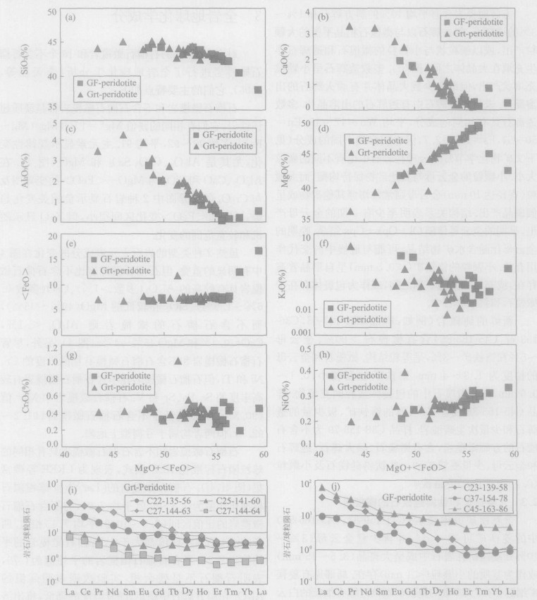 图 4 K2O、Al2O3、MgO、NiO、FeO、Cr2O3、SiO2与MgO+< FeO>的变异图(a—h), 石榴石橄榄岩较不含石榴石橄榄岩有相对高的Al2O3、CaO、SiO2和低的MgO以及含量相同的Cr2O3和NiO; 2种岩石均显示球粒状陨石标准化LREE富集模式, 但石榴石橄榄岩的REE丰度要高于不含石榴石橄榄岩(i, j)