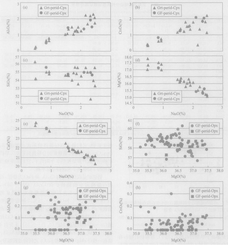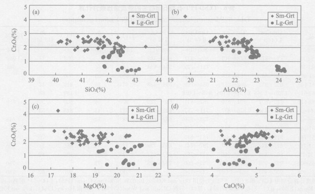 图 8 石榴石橄榄岩中变斑晶石榴石(Lg-Grt)和等粒石榴石(Sm-Grt)的组分是变化的, Sm-Grt比Lg-Grt有相对高的Cr2O3和相对低的Al2O3、MgO、SiO2含量