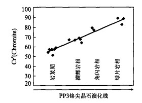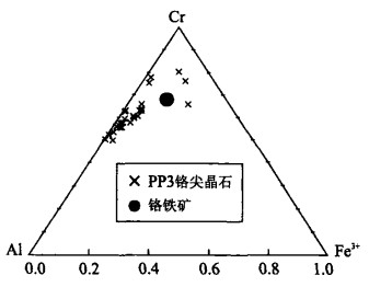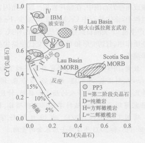 图 5 铬尖晶石成分图解(a)和铬尖晶石Cr2O3与斜方辉石Al2O3关系(b) 图a据Guillot et al., 2001;图b据Kepezhinskas and Defant, 1997 Fig. 5. Composition of chromium spinels (a) and diagram of Cr2O3 of chromium spinels and Al2O3 of orthopyroxene (b) 图 6 橄榄石Mg#和铬尖晶石Cr#图解(Pearce et al., 2000) Fig. 6. Plot of chromium spinel Cr# against olivine Mg# for the PP3 peridotites 图 8 铬尖晶石矿物Cr#演化变化(据Klemme, 2004修改) Fig. 8. Evolution of Cr# of PP3 chromium spinels 图 11 PP3铬尖晶石TiO2与Cr#图解(Pearce et al., 2000) Fig. 11. Diagram of TiO2 and Cr# of PP3 chrome spinel 表 1 铬尖晶石电子探针分析结果 Table 1. Composition of chrome spinels   表 2 32个氧原子时铬尖晶石分子式和参数 Table 2. Molecular formula and parameter of chrome spinels